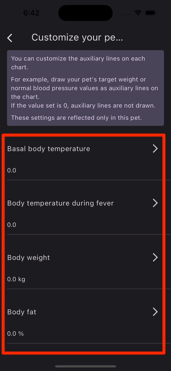 You can draw your pet's target weight, normal blood pressure, etc. as auxiliary lines on each chart.