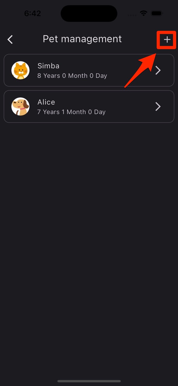 Tap the Add button in the upper right corner of the screen to go to the pet registration screen.